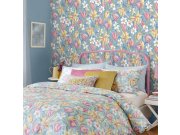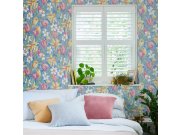 Vliesové tapety na zeď, podklad modrý, květiny v odstínech oranžové, růžové, modré a zelené.