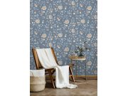 Modrá vliesové tapety na zeď, motivy květin v odstínech modré, hnědé, béžové a růžové.