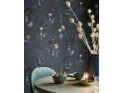 Tmavě modrá vliesové tapety na zeď, květiny a motýli v odstínech zelené, růžové, šedé a hnědé.