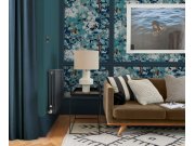Zeleno-modrá, jemně strukturovaná, vliesové tapety na zeď, větvičky a listy v odstínech zelené, modré, okrové a hnědé.