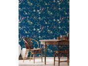 Tmavě modrá vliesové tapety na zeď, jemně plastické květy dřínu v odstínech bílé, modré a zelené.