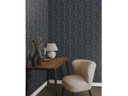 Šedo-modrá vliesové tapety na zeď, dekor ozdobného hnědo-zlatého kovéní.
