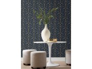 Modrá vliesové tapety na zeď, dekor ozdobného hnědo-zlatého kovéní.