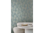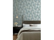 Luxusní metalické modrá vliesové tapety s vinylovém povrchem, plastické motivy palmovéch listů, odstíny šedo-modré, hnědé a zlaté. Foto interiéru je pouze ilustrační - odlišné barvy.