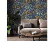 Modrá vliesové tapety na zeď, větvičky a listy v odstínech tyrkysové a okrové, vzhled hrubší textilie.