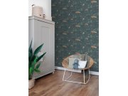 Tmavě modrá hladká vliesové tapety na zeď, dětské vzory přírody a zvířátek v odstínech hnědé a zelené.
