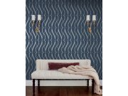 Modrá hladká vliesové tapety na zeď, plastické stříbrné linie a kruhy.