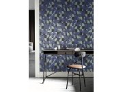 Luxusní, jemně plastické, geometrické vliesové tapety na zeď, odstíny modré, černé a pololesklé zelené.