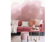 Vliesové obrazové tapety, motiv svěží laguny, palmy, ptáci, podklad světle růžové.