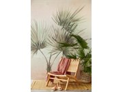 Vliesové obrazové tapety, motiv svěží laguny, palmy, ptáci, podklad světle růžové.