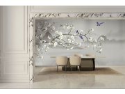 Luxusní vliesové obrazové tapety na zeď, motiv krajiny s rozkvetlou větvičkou Sakury a s ptáky. 5 dílů š. 1 x v. 3m. Foto interiéru je pouze ilustrační - odlišné barvy.