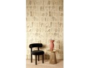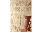 Vliesové tapety na zeď, hrubší látkové textura, motivy rostlin a nerostů na poličkách, odstíny béžové, hnědé a šedé. Tapety má návazný vzor - pro větší šířku stačí koupit další kus - viz foto. Co vás zaujme: věrnost imitace látky, inspirace uměleckými díl