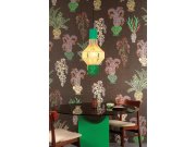 Vliesové tapety na zeď, hrubší látkové textura, motivy rostlin ve vázách, odstíny hnědé, zelené a fialové. Pro větší šířku lze kombinovat s fototapetou DGJOY1031-260 - viz foto. Co vás zaujme: věrnost imitace látky, inspirace uměleckými díly. Design: rust