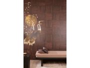 Vliesové obrazové tapety na zeď, jemná textilní textura, pozadí v odstínech zelené, šedé a bílé, zlato hnědé kvetoucí sakury a letící bílo šedí jeřábi s červenou chocholkou. Pro větší šířku lze kombinovat s tapetou DGTRA4031-260 a DGTRA4032-260 viz foto.