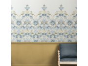 Vliesové tapety na zeď, bohatý ornamentální vzor s květinami, listy, ptáčky a jahodami, odstíny modré a hnědé. 8 dílů 0,5 x 2,5m. Co u vás zaujme: kolekce vytvořená ikonou světového designu. Design: nadčasové, přírodní. Úroveň tapetovéní: pro začátečníky.