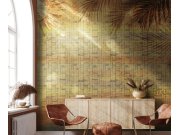 Luxusní vliesové obrazové tapety na zeď s vinilovém povrchem, tropické slunce, podklad v odstínech hnědé, žluté a béžové s hnědými obrazci, slunce v odstínech žluté a bronzové a hnědé listy palmy. z 5 dílů, každý v rozměru 100 x 300cm (š/v). Tapety má na