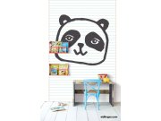 Hlava pandy na podkladu s žíhaným růžovém vzorem.