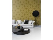 Okrové vliesové tapety na zeď, geometrický vzorek v retro stylu - efektní střídání pololesku a matu. Foto interiéru je pouze ilustrační.