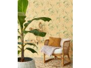 Okrové vliesové tapety na zeď, motiv tropických listů, zlatých opiček a ptáků.