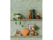 Okrové vliesové tapety na zeď, motivy listů v odstínech tyrkysové, šedé, hnědé a béžové. Látkové textura.