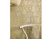 Krémové vliesové tapety s vinylovém povrchem, motivy tropických listů v odstínech zelené a okrové, místy se zlatými odlesky.