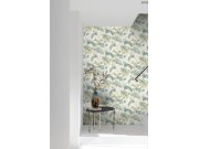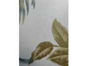 Krémové vliesové tapety s vinylovém povrchem, motivy tropických listů v odstínech zelené a okrové, místy se zlatými odlesky.