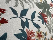 Vliesové tapety na zeď, motivy květin v odstínech zelené, tyrkysové, cihlově červené a béžové. Jemná krupičkové textura.