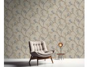 Luxusní pískové vliesové tapety s vinylovém povrchem, efekt jemné textilie s rozkvetlými větvičkami v odstínech metalické zlaté, hnědé a šedo-modré.