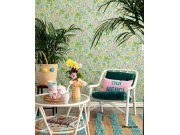 Růžové vliesové tapety s vinylovém povrchem, květinové vzor v odstínech zelené a modré.