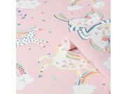 Hladká růžové vliesové tapety na zeď, dětské motivy duhy a jednorožců. Tato zábavná a báječná tapety je dokonalým způsobem, jak rozzářit každý dětský pokoj. Kdo by neměl rád duhy a jednorožce? Výrazná pastelové barevná paleta oživuje tento design, který d