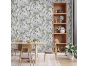 Růžové vliesové tapety s vinylovém povrchem, květinové vzor v odstínech zelené a modré.