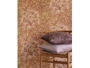 Růžové, jemně strukturovaná, vliesové tapety na zeď, větvičky a listy v odstínech hnědé, okrové a lila.