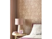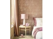 Jemně plastické, starorůžové pololesklá vliesové tapety s vinylovém povrchem - motivy rozkvetlých větviček a ptáčků v odstínech vínové, béžové, zelené a zlaté. Foto interiéru je pouze ilustrační - odlišné barvy.