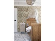 Světle béžové vliesové tapety se secesním květinovém vzorem v odstínech zelené, hnědé, béžové a starorůžové.