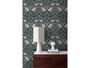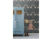 Temně modrá vliesové tapety se secesním květinovém vzorem v odstínech zelené, hnědé, béžové a starorůžové.