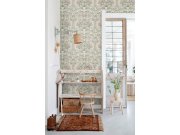 Zelená vliesové tapety se secesním květinovém vzorem v odstínech zelené, béžové, šedé a hnědé.