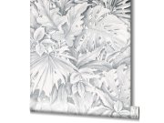 Šedá vliesové tapety na zeď s vinylovém povrchem inspirované palmovém listem, která je zajímavé především kontrastem jemných metalických linií na matném podkladu.