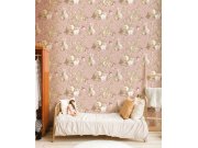 Šedo-béžové vliesové tapety na zeď, motivy lesních zvířátek a rostlin. Foto interiéru je pouze ilustrační - odlišné barvy.