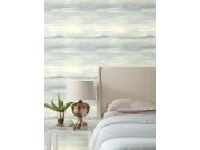 Šedo-modrá vliesové tapety na zeď, vzor evokuje ruční malbu krajiny v mlze.