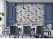 Luxusní šedo-modrá vliesové tapety s vinylovém povrchem, efekt jemné textilie s rozkvetlými větvičkami v odstínech hnědo-zlaté a šedo-bílé.