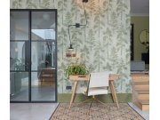 Jemně strukturované vliesové tapety na zeď, odstíny šedé a zelené, na listech metalické linie. Foto interiéru je pouze ilustrační - odlišné barvy.