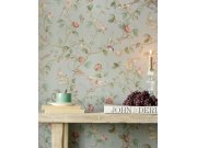 Šedo-zelená tapeta s květinami a ptáky