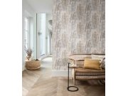 Vliesové tapety s motivem velkých šedých a hnědých listů na béžovém podkladu s textilní strukturou.