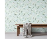 Světle modrá vliesové tapety na zeď, jemně plastické květy dřínu v odstínech bílé, béžřové, modré a zelené.