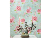 Vliesové tapety s hladkou texturou. Ptáci, ptačí klece a květiny na matném podkladu s metalickým vzorkem.