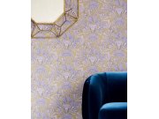 Přírodní motivy v modro-fialovéch barvách na zelené vliesové tapetě.