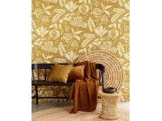 Vliesové tapety s vinylovém povrchem - imitace hrubě tkané látky s botanickým batikovaným efektem v tlumených hořčicovéch tónech, vzor světle béžové.