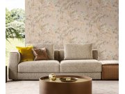 Luxusní vliesové tapety s vinylovém povrchem, podklad hrubší béžové látkové textura, bohatý květinové vzor v jemných odstínech béžové, hnědé, fialové a žluté.
