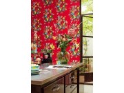 Vliesové tapety s látkovou texturou. Rostliny, ptáci, květiny a motýli na červeném podkladu.