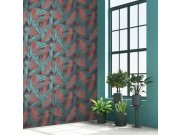 Vliesové tapety na zeď s vínovémi a tyrkysovémi a metalickými listy palem na strukturovaném podkladu.